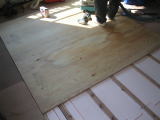 まずは解体工事。床をめくり断熱材を敷き詰めます。(写真1〜3枚目) 厚わずか2mmという薄さ